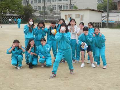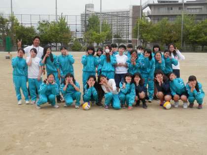 予定していた種目の測定が速く終わったようで、残った時間にバレーボールをするようです。思わず記念写真を撮るようなことになりました。