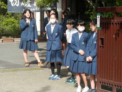 校門には生徒会本部の子たちと生活環境委委員の子たちが挨拶に立ってくれています。