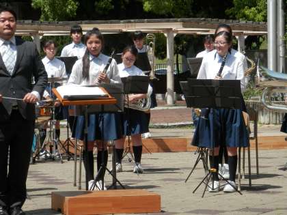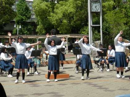 2曲目には、まだ楽器の吹けない1年生がダンスを披露します。これは東中も同じでした。おっと、1年生の中に、一人だけトランペットパートで演奏に加わっている人がいました。