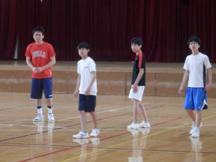 体育館から元気のよい声が響いています。男子バスケットボール部です。