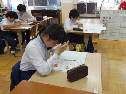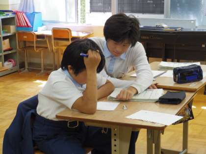 6組の数学の授業の様子です。わからない問題は,他の人に聞いてみる・先生に質問してみる・・・いろいろな解決方法がありますね。今度はできるようになれば,他の人に教えてみたり,自分で解いてみたりしてみましょう。がんばれ。