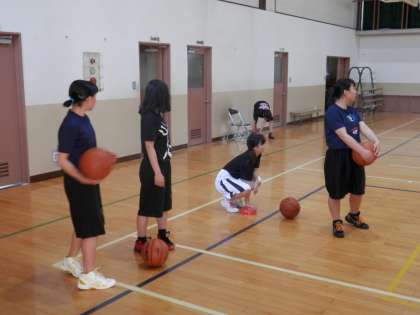 体育館では女子バスケットボール部がしっかりと練習しています。