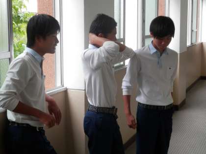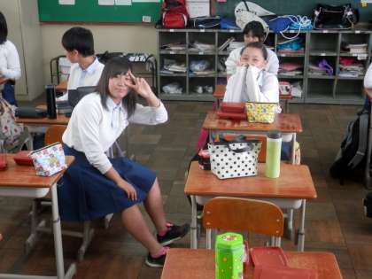 廊下の二人は給食当番です。みんなの給食を取りに行ってくれます。