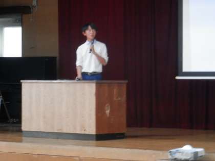 生徒会長、副会長、生活環境委員長が、生徒会の目標や所属する各委員会の活動について話しました。