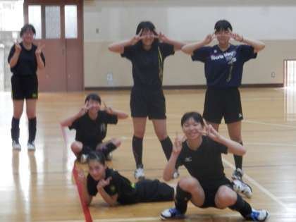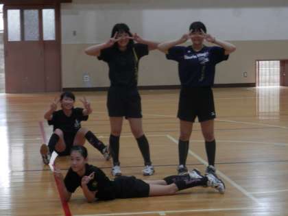 体育館ではバレー部が活動を始めました。今はまだ準備運動です。