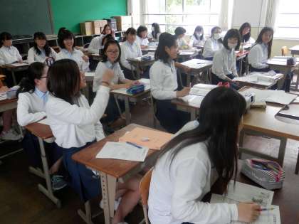 2年からは、1・2組女子の保健、3組の家庭科、4組の英語の時間の様子を観てもらいます。