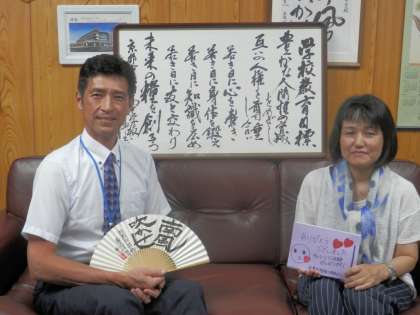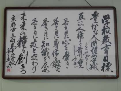 書家の奥村先生が、先日2年のチャレンジ講話の際に書いてくださった「学校教育目標」をもってきてくださいました。