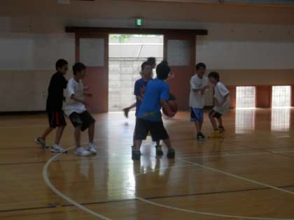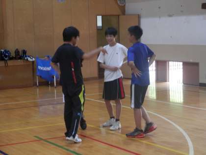 体育館では男子バスケットボール部とバレー部が練習中です。