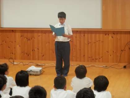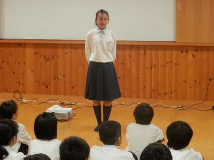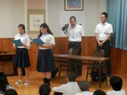 午後、1年生が太田前校長先生と教育委員会調査課の津田係長をゲストティーチャーとして招いて、かつての向島中学校についてお話を聴きました。