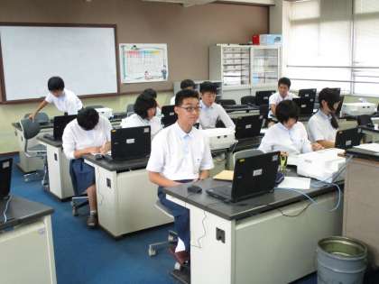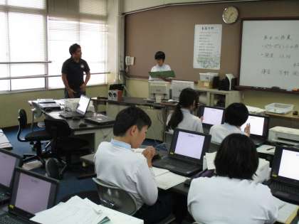 南校舎4階の一番端のコンピューター教室で見つけました。パワーポイントソフトを使ってプレゼンテーションの練習です。