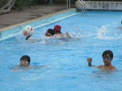 1時間目、豪雨の中プールに入っていました。水球でしょうか、楽しそうでしたよ。