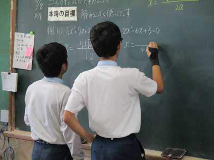 2次方程式の解の公式を使った解き方を学んでいます。まだ始めの段階で、皆さん、公式を見ながら数字を当てはめていっています。