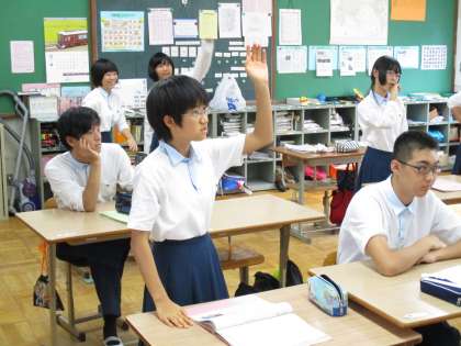 先生が英語で質問するのに分かった人が挙手をして答えます。