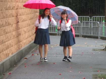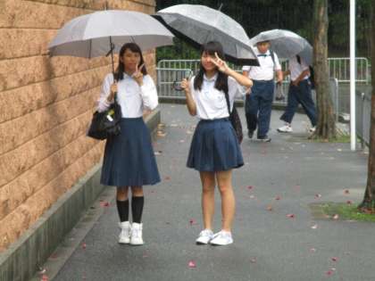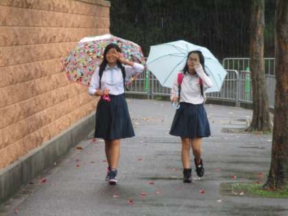 校門に立っているだけで、ズボンの膝から下の部分がずぶ濡れです。