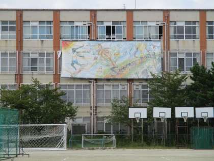 朝から先生方によって南校舎のグランド側の壁に掛けられました。