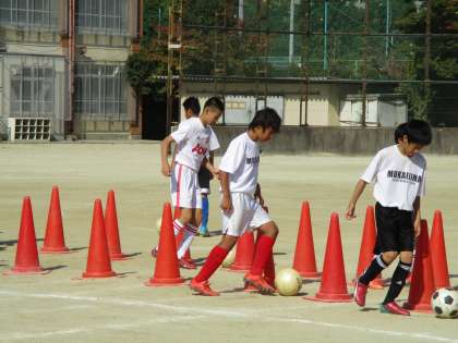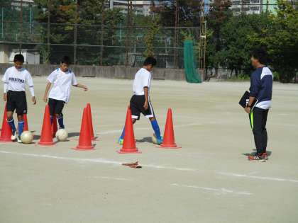 サッカー部は、広い練習場所があるにも関わらず、敢えて小技の練習です。