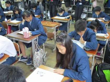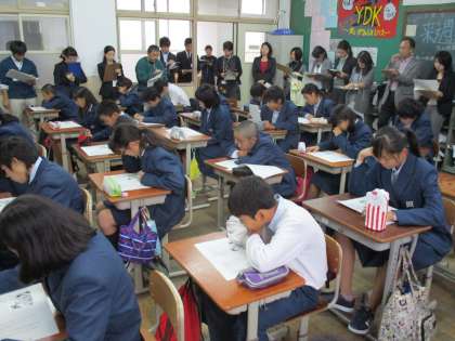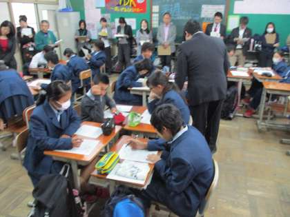 授業者は辻内先生、対象学級は1年1組でした。伏見支部の先生方が約20人来られ、本校の教職員を加えて、30人程が参観しました。