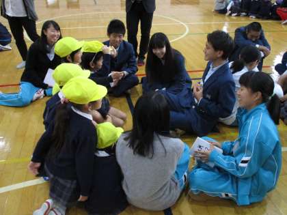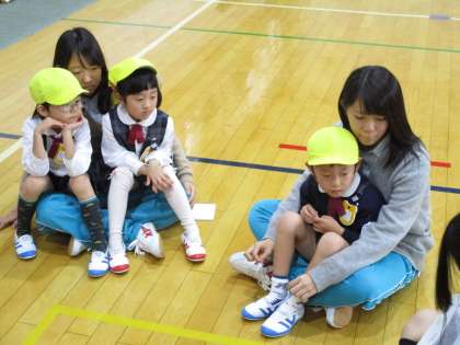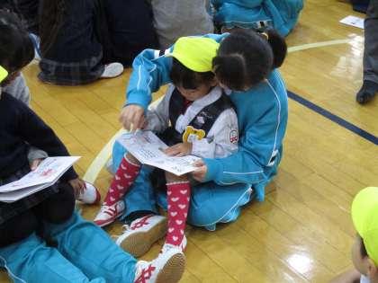 園児さんたちは中学生にすっかり慣れたようで、安心して膝の上に乗っかっています。