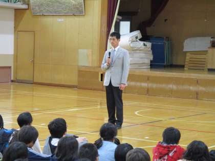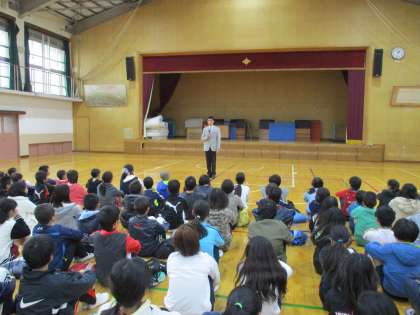 まずは学校長のご挨拶です。6年の児童たちは緊張して話を聴きました。