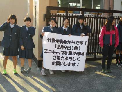 今週末にエコキャップを回収するということで、生徒会役員がキャンペーン活動をしてくれています。