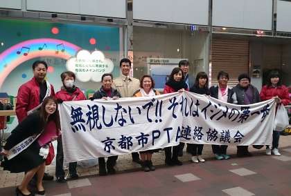 12月3日(土)伏見支部人権尊重啓発活動の学習会が伏見中学校で行われました。学習会では本校の澤田校長先生が道徳形式の講義をされました。いつ聴いても、校長先生の道徳の授業は心に響くものがあり,とても人権について真剣に考えられました。続いて,澤田校長先生、田中教頭先生、PTA本部役員で大手筋商店街において街頭啓発活動として「人権尊重」を訴えながら、カイロ配りを行ないました。いつも受け取る側だったのですが、手渡す側は初めてでした。緊張しつつも、澤田校長先生の道徳を思い出し、少しでも人権尊重の意識が伝わって欲しいという思いで一生懸命配りました。