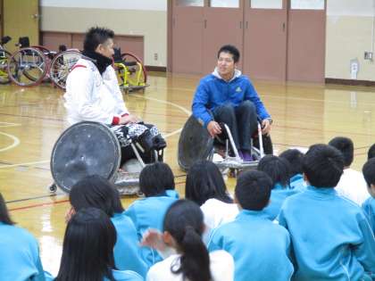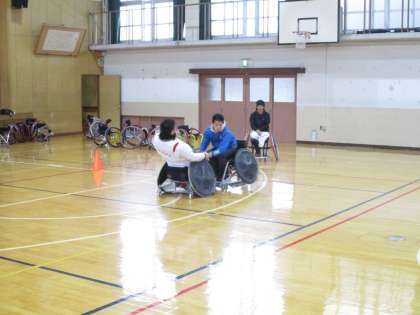 一番若い桂田先生が車いすラグビーのタックルを体験しました。