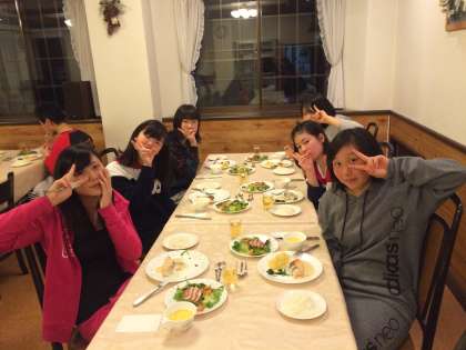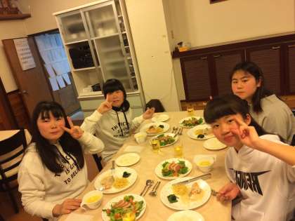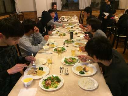 各宿舎でテーブルマナーを教えていただいて夕食を食べ始めました。2年1組の様子です。