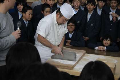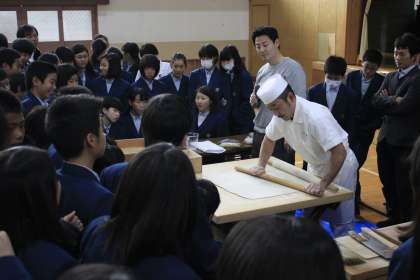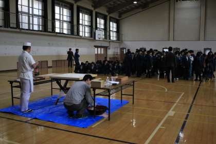 本日,6限に1年生は,出前授業を実施しました。河村製粉株式会社より2名の講師の先生をお招きし,そば打ちの実演をしていただきました。これは本校のキャリア教育の一環として,生徒へ生衛業の魅力を伝え,来年度実施する「生き方探究チャレンジ体験」の事前学習として行っています。目の前でプロの実演を魅せていただき,生徒も関心を深めているようでした。