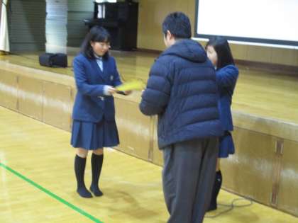 学年レクレーションで、個人的に大活躍した2人と頑張った学級に学年主任の先生から表彰状が渡されました。