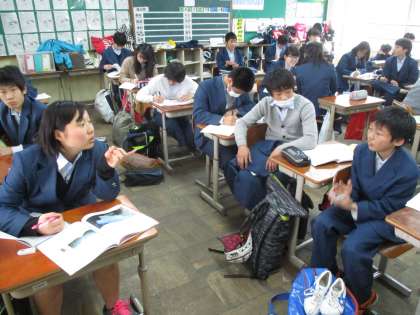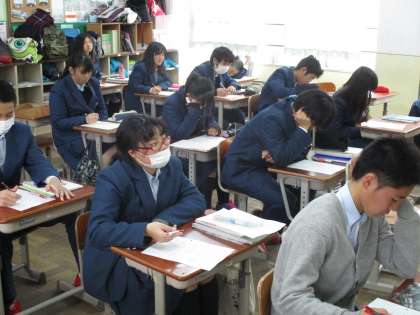授業開始直後、英語の時間に先生の来られるのを生徒が待っています。