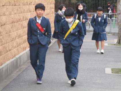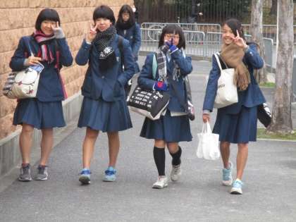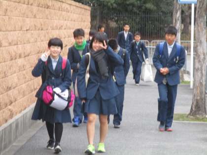 スカート姿の女子は男子以上に寒いでしょうに、カメラを向けるとピースサイン!