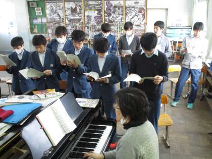 3組が音楽の時間に「卒業生を送る会」で歌う合唱の練習を始めていました。