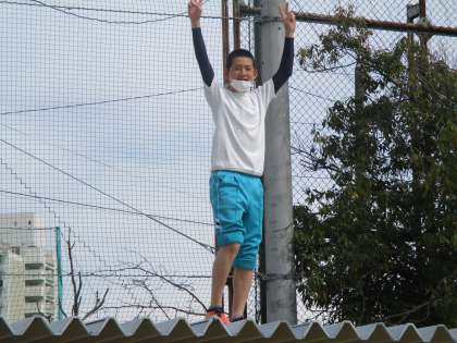 おいおい気を付けてや。体育倉庫の屋根にボールが乗ったとのことです。