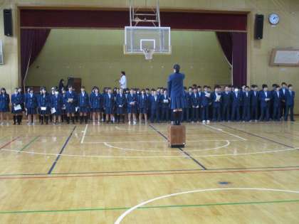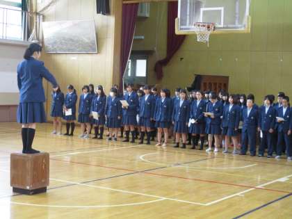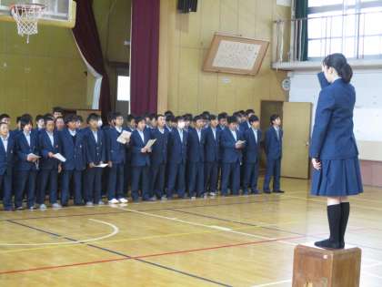 5時間目、1年が体育館で、卒業生を送る会の学年合唱練習を行いました。