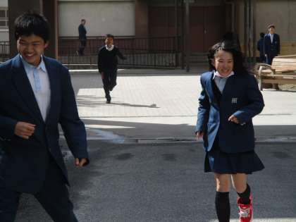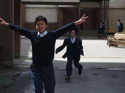 中庭では生徒が走り回っています。
