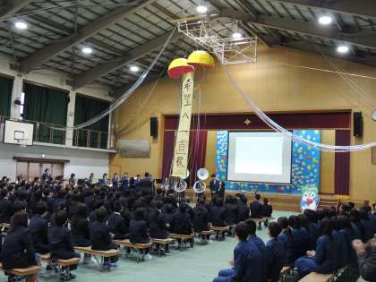 その後,生徒会からの記念品贈呈,新入生代表の挨拶のあと,恒例のくす玉割りがありました。