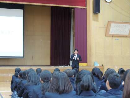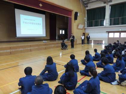 本日1日(月)4限に全校集会を行いました。まず,最初に車いすテニスの大会で優勝という立派な成績を残してくれました。その表彰式を行いました。本当におめでとうございます!その後,特別ゲストとして元ラグビー日本代表吉田朋生選手にお越しいただき,今までのラグビーを通して経験したことなどをたくさん話していただきました。