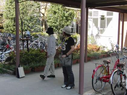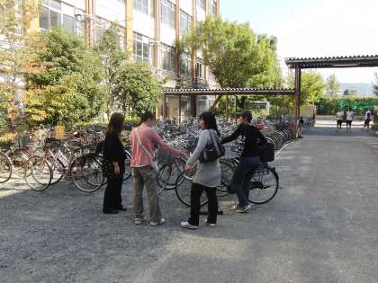 学級委員さんによる自転車整理の様子と、本部役員さんによる来賓受付の様子です。