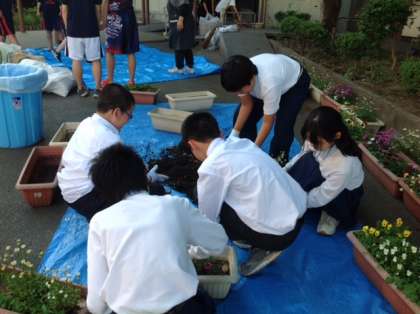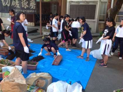 22日(月)の放課後に,6組と女子バスケットボール部の皆さんがプランタの土の入れ替えの作業を行ってくれました。みんな協力して最後までしっかりやってくれました。本当にありがとうございました。