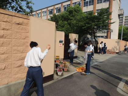 本日30日(火)の朝,生活環境委員中心に学校の周辺の清掃活動を行いました。有志の生徒も含めてたくさんの生徒が集まり,用具が足りないぐらいの大盛況でした。それぞれグループごとに分かれて,学校の外周を中心にきれいに掃除をしてくれました。今後も校内も含めて,日常から美化意識を高めていってください。