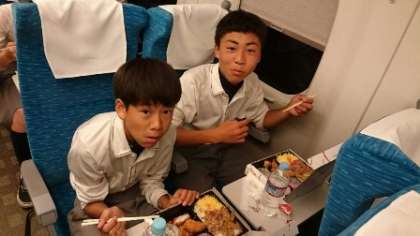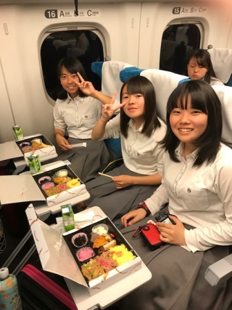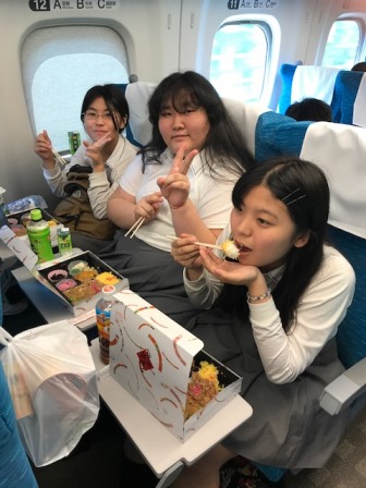 新幹線の車内にてお弁当が配られ,昼食の時間です。しっかり食べて午後の活動に備えよう。