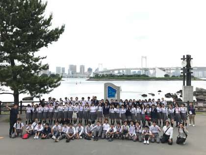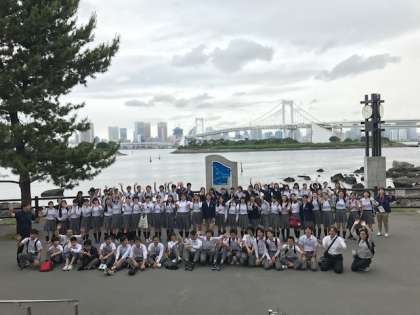 みなさんお馴染みのレインボーブリッジをバックに全体写真。みなさんの思いが通じ,雨の予報もなんのその。ばっちり撮れました。