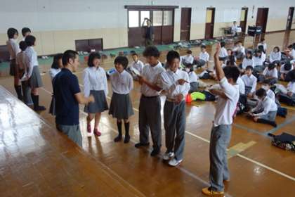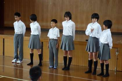 本日5時間目,明日からの宿泊学習に向けて結団式を行いました。リーダーや各委員からの意気込みや連絡のあと,夜レクに向けて歌の練習をしました。今日の話であったように,聴くところと盛り上がるところのメリハリをつけて楽しく過ごしましょう。