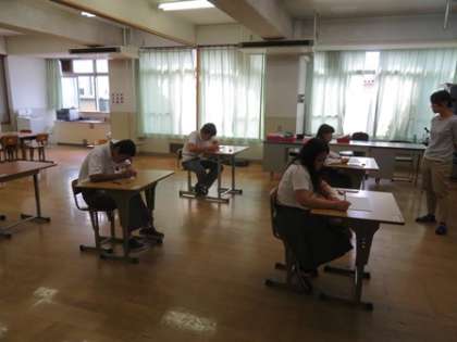 14日,15日と第3回テストが行われました。3年生にとっては進路を決めていく上で今回と次回の第4回テストがとても大切ですね。結果もそうですが,これまでよりも頑張れたかどうかが,大事です。まわりの人と比べるのではなく,今までの自分と比べてどうだったか,です。1年生は中学に入って3回目のテスト。もう慣れてきましたか?2年生にとっては中学校生活折り返しのテストでした。いよいよ後半に入りますね。テストが返ってきたら,しっかりと見直しをしましょう。写真は3年生と5組のテストの様子です。