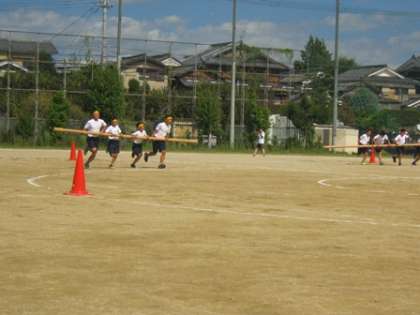 1年生学年団体種目「グルグル・グールグル」1本の棒を数人でポイントでグルグル回りながら走っていく。各クラスの団結が問われる。1位に輝いたのは2・5組でした。