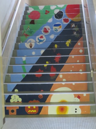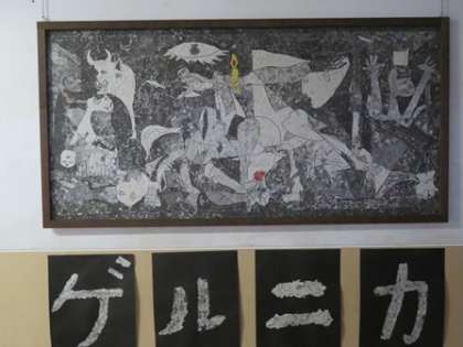 各学年の作品です。1年生は階段アート,2年生はモザイクアート,3年生は新聞紙の貼り絵による「ゲルニカ」です。
