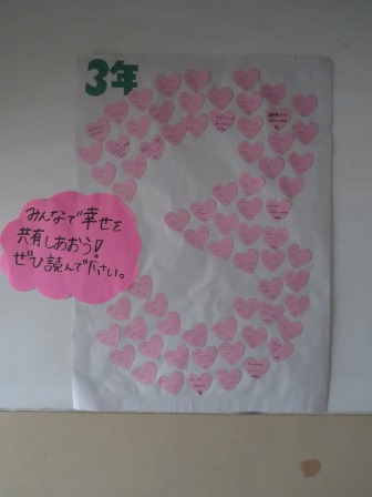 今年の全校展示は言葉の力をテーマに「うれしかった言葉」と「その場面」を全校のみんなが書いて生徒会がとりまとめて,掲示物を作ってくれました。たくさんの心暖まる言葉が並んでいます