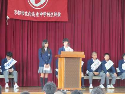 本日の5,6限は第35期生徒会本部役員を決める立会演説会と投票が行われました。初めに選挙管理委員長からあいさつがあり,各候補者と応援弁士からの演説がありました。先ずは生徒会長,1年生の副会長候補からです。