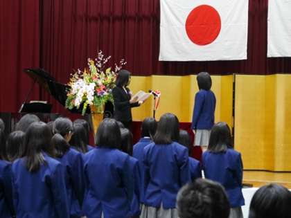 PTAの方からの記念品贈呈です。代表生徒がしっかりと受け取りました。そして式はいよいよクライマックスです。卒業式の歌。今年度は「友〜旅立ちの時〜」震災学習で学んだことと共に福島で同じく卒業を迎える仲間へ届ける合唱が始まりました。
