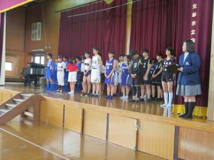 いよいよ始まる春体に向けて,今日は激励会がありました。生徒会本部が主催で各部のキャプテンが決意を発表しました。先ずは入場と校歌斉唱の様子です。エールを込めてみんなでしっかりと歌いました。